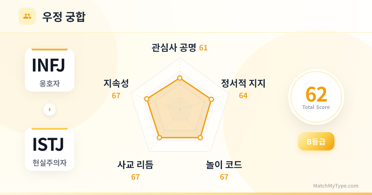 이 관계는 할리우드 영화 속 불꽃 튀는 사랑이라기보다, 백년가약을 맺은 동맹 관계에 가깝습니다. INFJ와 ISTJ는 모두 내향형 판단형(IxxJ)으로, 질서와 확실성, 그리고 충성을 갈망합니다. INFJ는 ISTJ에게 부족한 따뜻함과 원견을 가져다주고, ISTJ는 INFJ가 꿈꾸던 현실적인 안착과 안정감을 제공합니다.