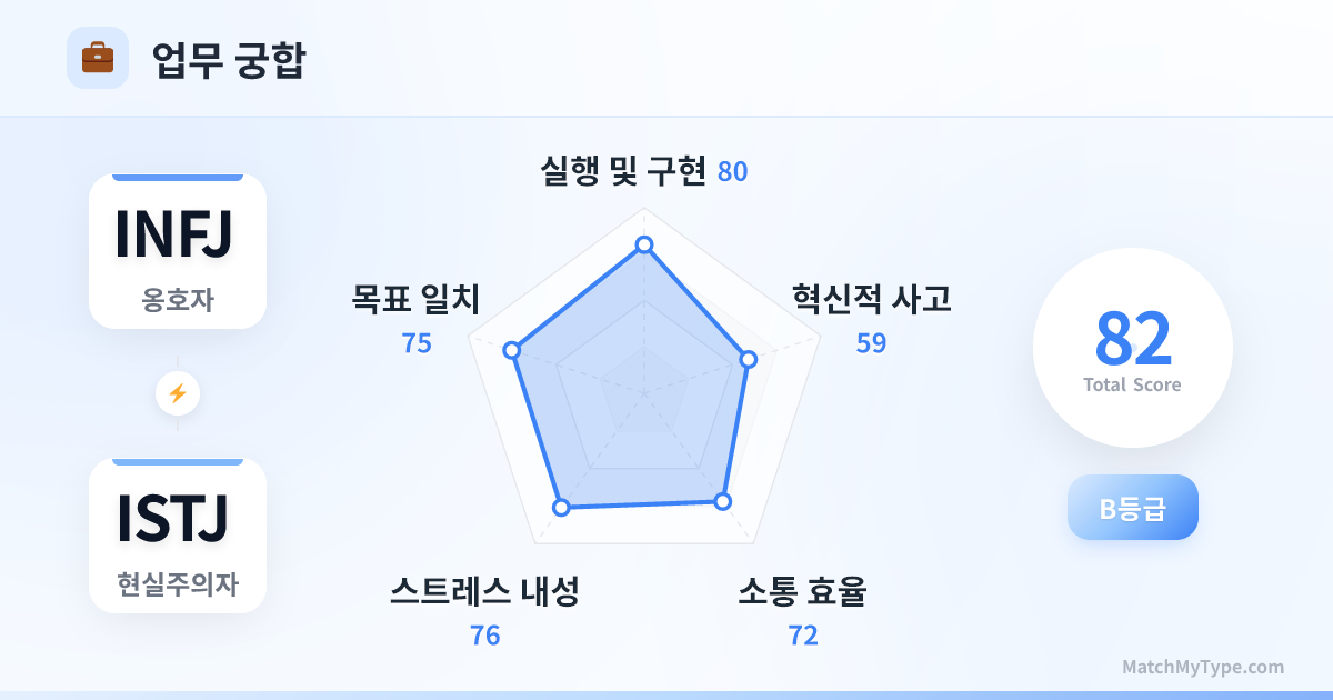 INFJ는 너무 추상적인 개념보다는 구체적인 비즈니스 가치로 변환해서 설명하세요. ISTJ는 새로운 아이디어를 바로 부정하지 말고, 먼저 INFJ의 논리적 흐름을 끝까지 들어주세요.