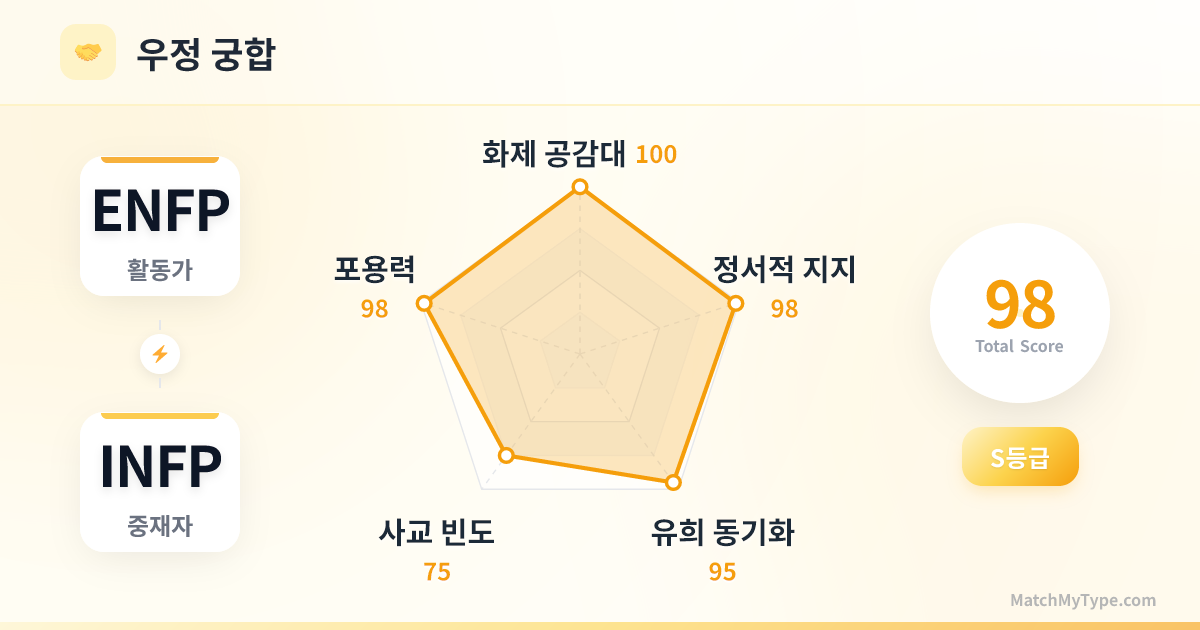 MBTI에서 가장 부러움을 사는 우정 조합 중 하나입니다. 여러분은 놀이 친구이자 서로의 심리 상담사입니다. ENFP는 INFP를 데리고 세상을 탐험하고, INFP는 ENFP가 자아를 잃지 않도록 붙잡아줍니다.