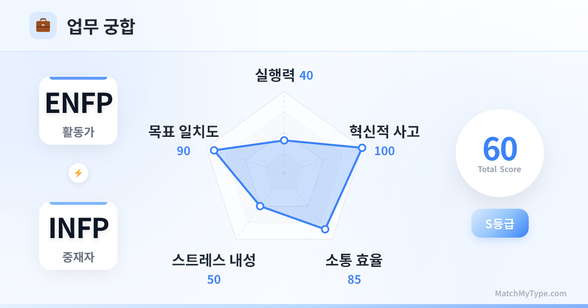 땡땡이 파트너. 두 사람이 같이 앉아 있으면 수다의 유혹이 너무 커서 업무 효율이 급격히 떨어집니다. 가장 좋은 방식은 ENFP가 대외 연락과 PPT 발표를 맡고, INFP가 내부 콘텐츠 작성과 디자인을 맡는 것입니다. 반드시 제3자에게 일정 관리를 맡기세요.