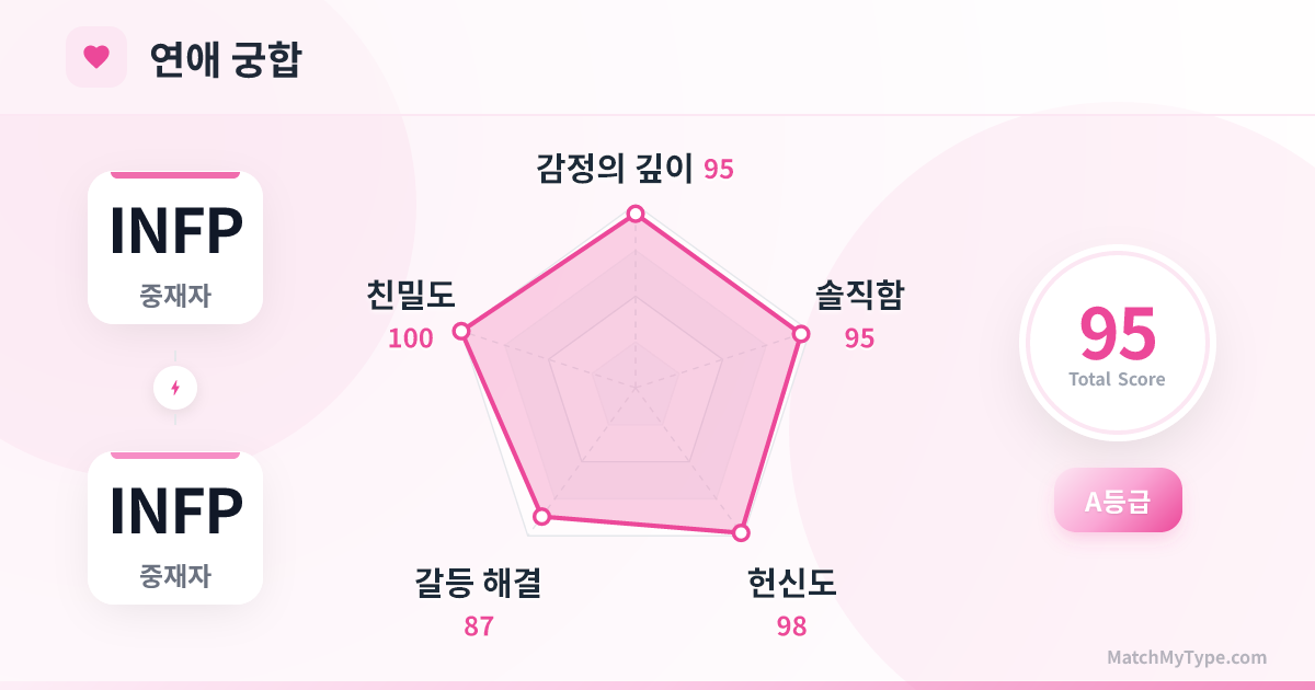 이것은 전형적인 '수선화 효과'입니다. 우리는 상대방에게서 이상적인 자신의 모습을 발견하고 사랑에 빠집니다. INFP는 평생 자신의 기이함, 민감함, 그리고 취약함을 완전히 수용해 줄 사람을 찾아 헤매며, 또 다른 INFP는 바로 그 완벽한 그릇이 되어줍니다. 당신들은 상대방의 독특한 분위기, 타인에 대한 연민, 그리고 우주를 담은 듯한 눈망울에 매료됩니다. 이 끌림은 상호 보완적인 자극이 아니라, 공명에서 오는 안정감에 기반합니다.