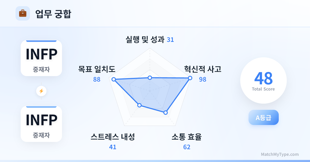 직장에서 두 INFP가 모이면 '최고의 창의적 팀'이자 '최악의 실행 팀'이 됩니다. 오후 내내 세상을 바꿀 아이디어를 구상할 수 있지만, 다음 달이 되어도 첫 발조차 떼지 못할 수 있습니다.