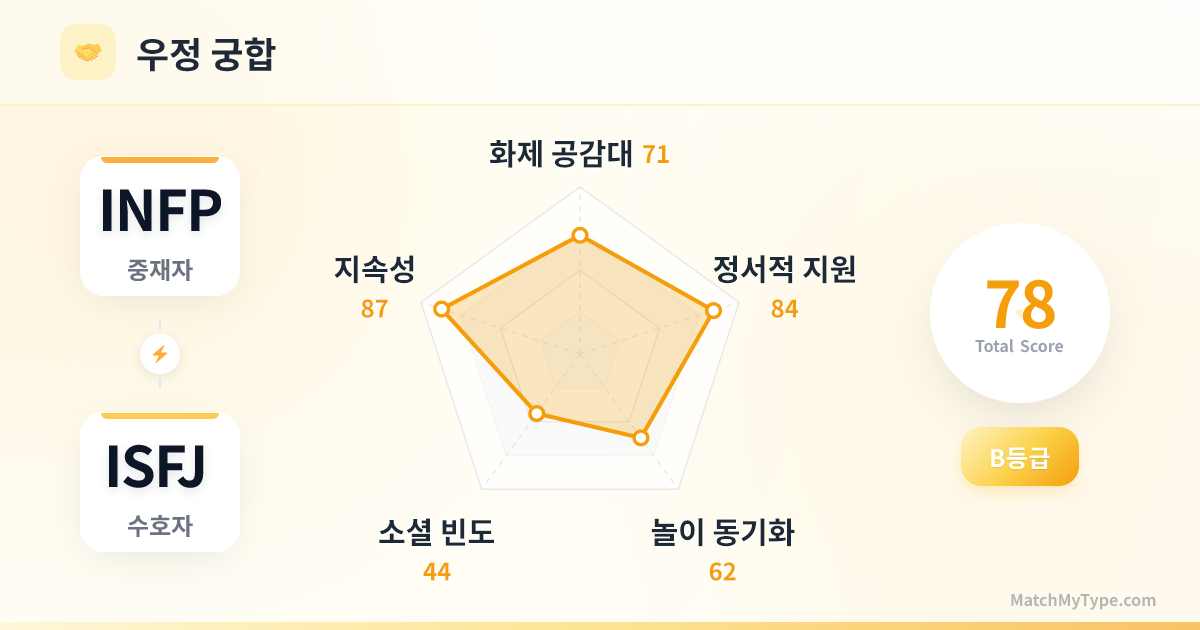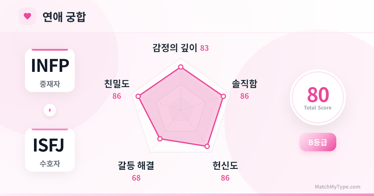 **가치관의 보이지 않는 충돌**: ISFJ는 전통적인 가치(결혼, 출산, 내 집 마련)를 선호하고, INFP는 자유(방랑, 딩크, 꿈 추구)를 선호합니다. 초기에 충분히 소통하지 않으면 미래에 근본적인 모순이 폭발할 수 있습니다.