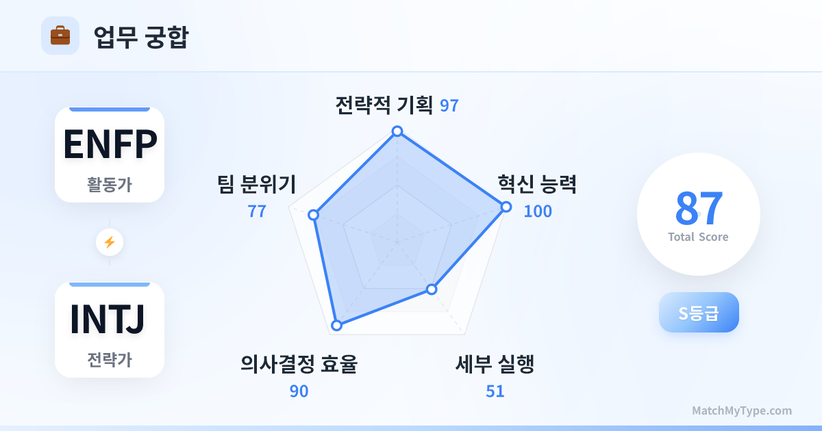 이것은 '몽상가'와 '전략가'의 결합입니다. ENFP가 방향을 제시하면 INTJ가 길을 닦습니다. 지루한 행정 업무만 맡기지 않는다면, 이들은 어떤 산업에서도 판도를 뒤흔들 수 있습니다.