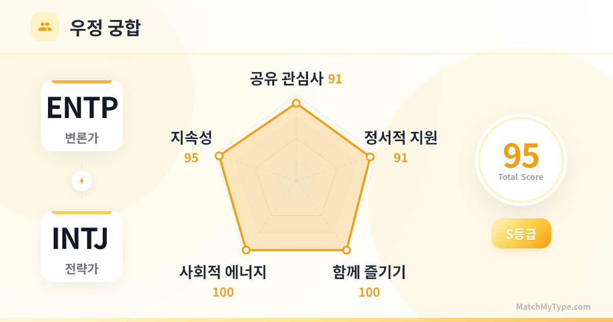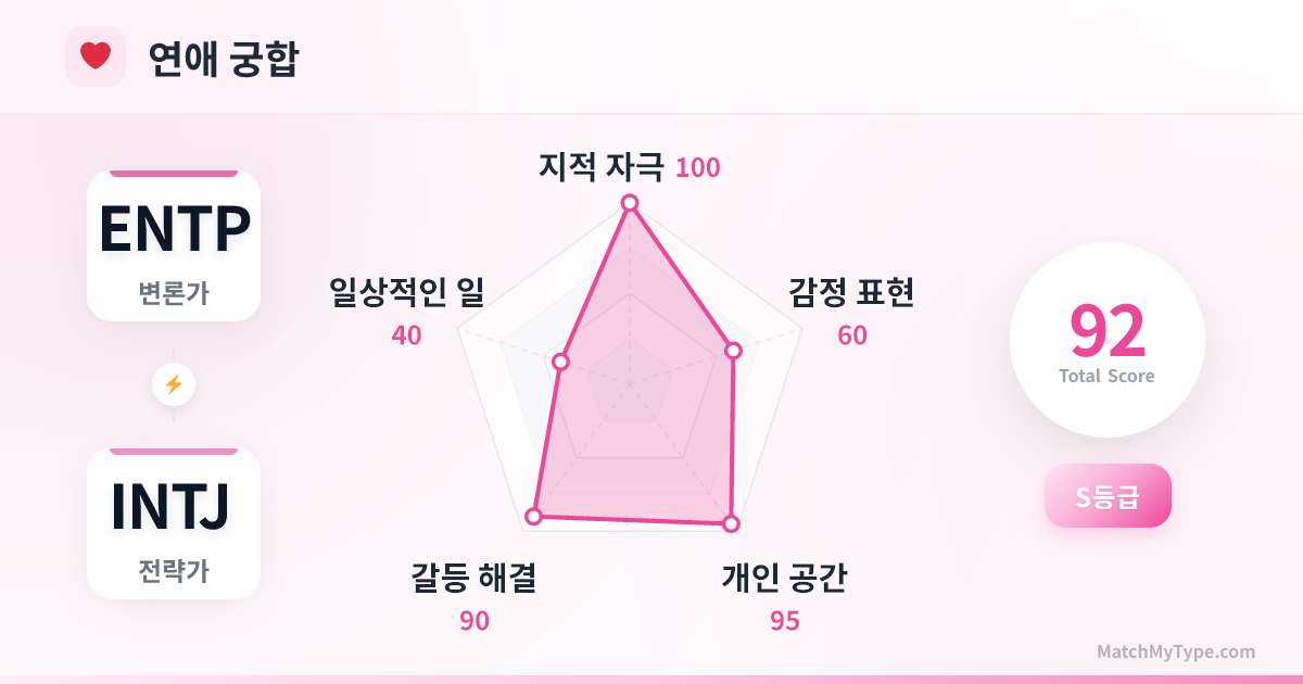 ENTP는 불을 지피고(아이디어 제공), INTJ는 엔진을 구축(실행)합니다. 이들은 지능 밀도가 가장 높으며, 버그투성이인 세상에서 함께 '돌파구'를 찾아낼 수 있는 최고의 커플입니다.