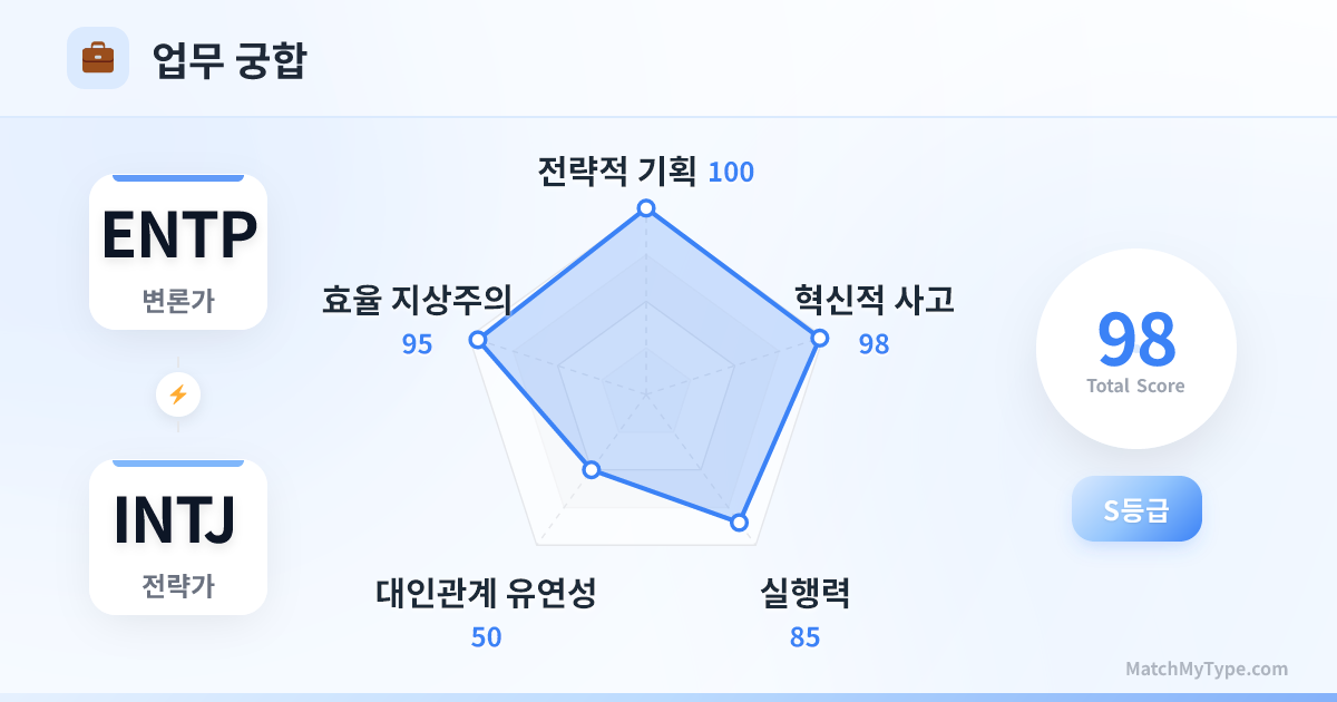 전략과 혁신의 완벽한 융합입니다. ENTP는 0에서 1을 만드는 창의적 구상에 능하며 막다른 골목에서 기발한 돌파구를 찾아냅니다. INTJ는 1에서 100을 만드는 시스템 구축에 능하며 ENTP의 아이디어를 복제 가능하고 규모 있는 비즈니스 모델로 변모시킵니다. 스타트업 창업자의 가장 이상적인 모델입니다.