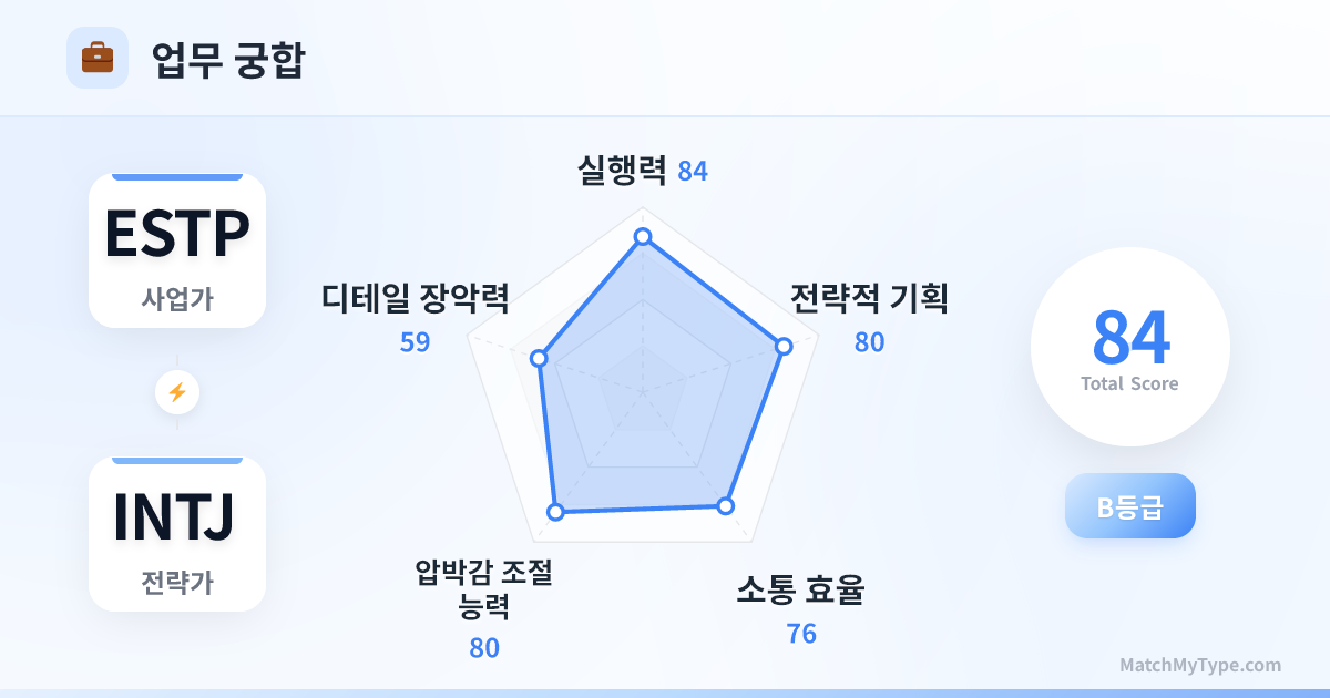 MBTI 세계관에서 가장 살벌한 비즈니스 조합 중 하나입니다. INTJ가 최상위 설계와 전략적 청사진을 제공하면, ESTP가 전술적 실행과 시장 공보를 담당합니다. 목표만 일치한다면 그 어떤 경쟁자도 무너뜨릴 수 있습니다.
