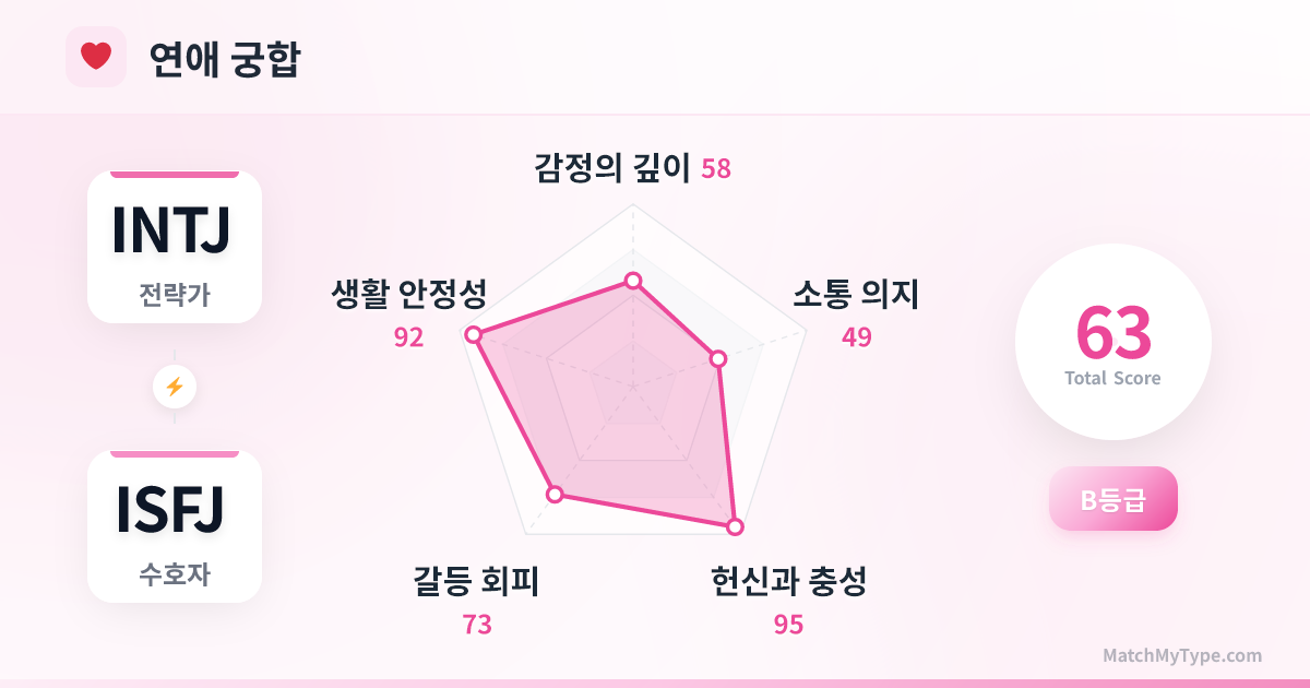 사고방식은 판이하게 다르지만, 두 사람 모두 J(판단형)로서 삶의 질서와 통제 가능성을 추구합니다. INTJ는 생활 속 디테일을 완벽하게 관리하고 소리 없이 챙겨주는 ISFJ의 모습에 마음이 움직이는데, 이는 INTJ의 부족한 생활 관리 능력을 보완해주기 때문입니다. 반면 ISFJ는 INTJ의 강한 자신감, 명쾌한 논리, 미래에 대한 확신에 매료되어 그를 의지할 수 있는 든든한 파트너로 인식하곤 합니다.