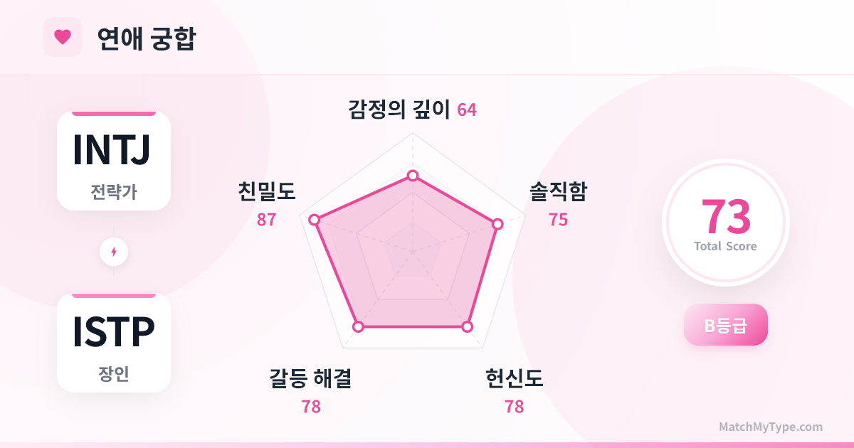 이것은 '고수끼리 알아보는' 끌림입니다. INTJ는 주변 사람들의 비효율성과 감정적인 모습에 지치는 경우가 많은데, ISTP의 차분하고 말수 적으며 깔끔하게 문제를 해결하는 능력에 매료되어 일종의 '완벽함'을 발견합니다. ISTP는 INTJ의 깊은 통찰력과 미래에 대한 자신감 넘치는 계획에 감탄하며, INTJ야말로 자신의 사고 속도를 따라오면서도 감정적으로 구속하지 않는 유일한 사람이라고 느낍니다.