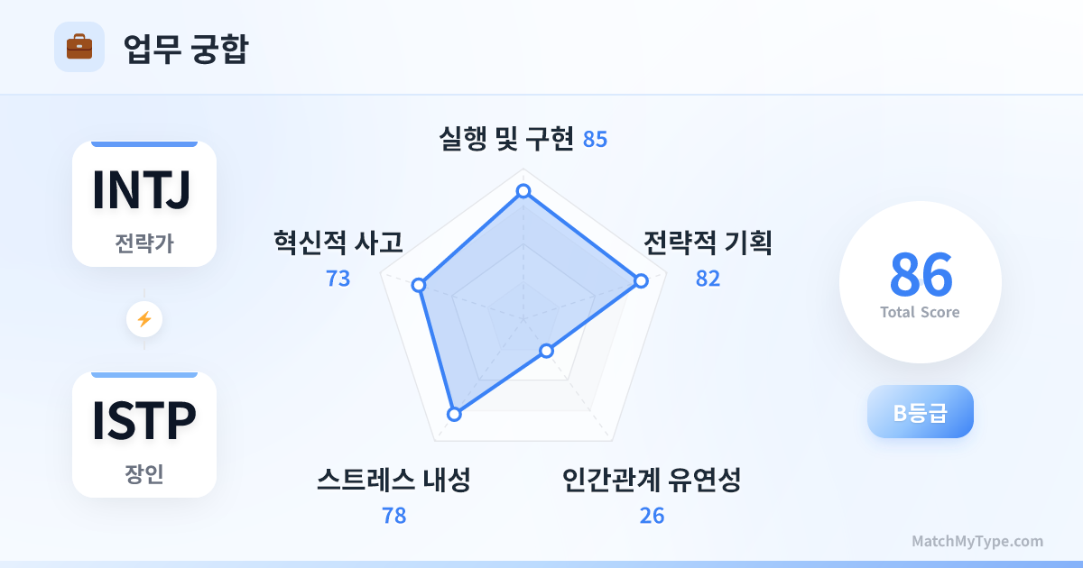 전략과 실행의 완벽한 폐쇄 루프입니다. INTJ는 시스템 아키텍처, 장기 계획, 리스크 예측에 능하며, ISTP는 기술적 한계 돌파, 응급 처치, 세부 조작에 능합니다. INTJ가 가리키는 곳을 ISTP가 정확히 타격합니다. 공학, 기술, 금융 분석, 외과 수술 등 높은 지능과 정밀도가 요구되는 분야에서 이들은 최강의 조합입니다.