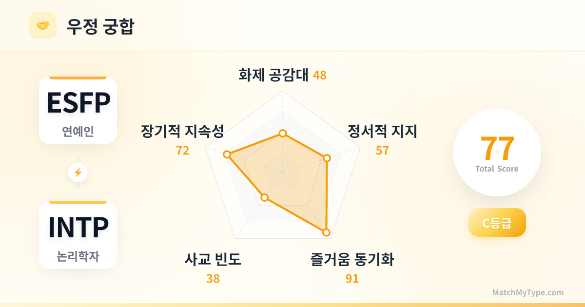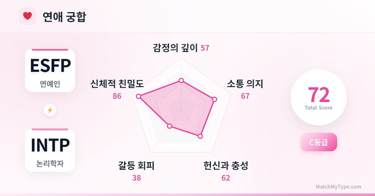 이것은 전형적인 '인싸'가 '너드'를 만났을 때의 이야기입니다. ESFP가 무대 중앙의 스포트라이트라면, INTP는 백스테이지 구석의 프로그래머입니다. 이러한 거대한 차이는 초기에는 치명적인 매력으로 작용합니다. ESFP는 INTP가 신비롭고 똑똑하다고 느끼고, INTP는 ESFP가 생기 넘치고 눈부시다고 생각하죠. 하지만 시간이 흐를수록 '상대의 사고 회로를 도저히 이해할 수 없어' 멘붕에 빠지기 가장 쉬운 조합이기도 합니다.