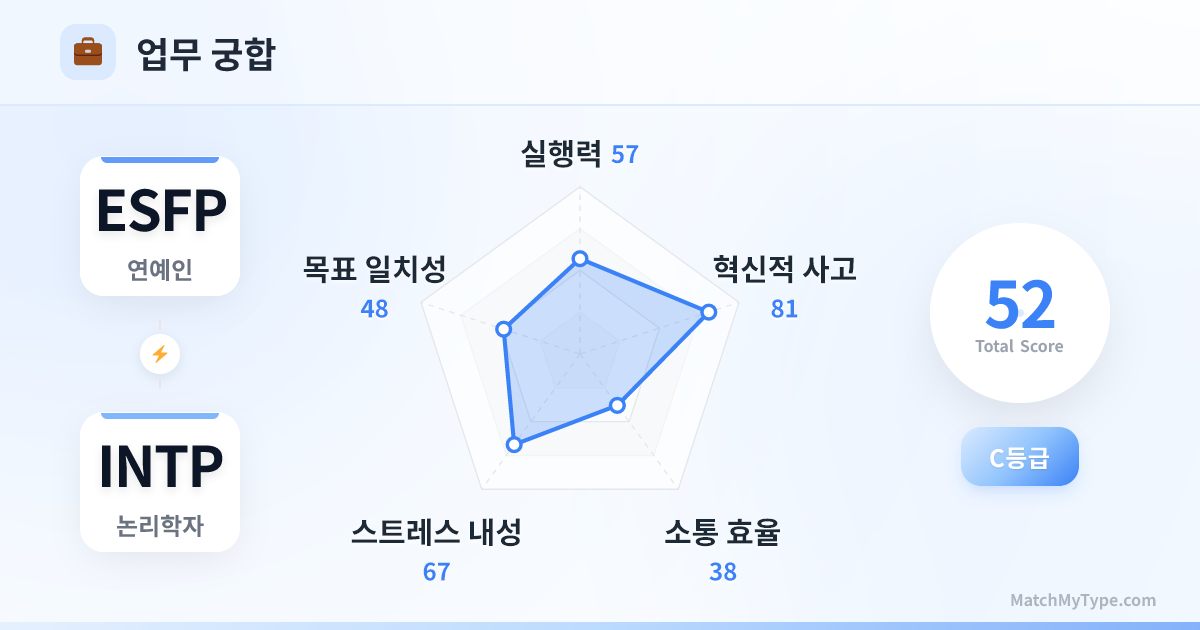 물리적 거리를 두는 것이 좋습니다. 같은 책상을 쓰면 ESFP가 계속 말을 걸거나 간식을 나눠 먹으려 해서 INTP의 몰입 상태를 방해합니다. 분업을 명확히 하세요. INTP는 문서와 데이터를 잡고, ESFP는 보고와 PPT 발표를 맡는 식이 좋습니다.