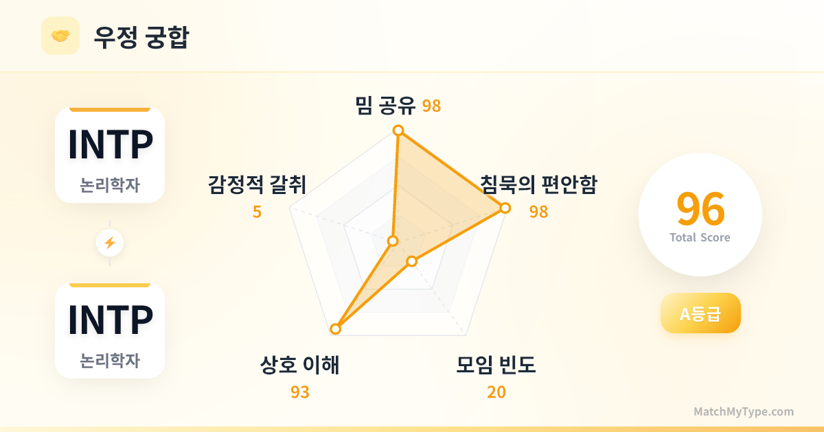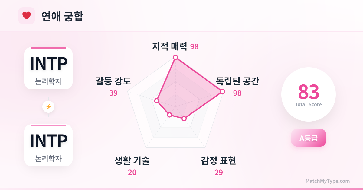 INTP와 INTP의 결합은 흔히 '두 로봇의 첫사랑'이라 불립니다. 이는 매우 에너지를 아끼고 효율적이며 순수한 관계입니다. 여러분은 존재감을 확인하기 위해 쉴 새 없이 떠들 필요도 없고, 사랑을 증명하기 위해 드라마틱한 싸움을 벌일 필요도 없습니다. 여러분의 세계에서는 '사랑'보다 '이해'가 더 중요하며, 이해하는 것이 곧 가장 수준 높은 사랑입니다.