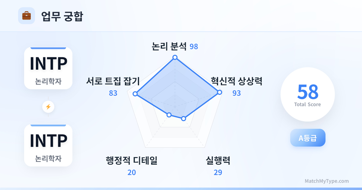 이 조합은 '천재 연구소' 조합입니다. 과제가 복잡한 논리 문제를 해결하거나, 디버깅, 혹은 순수 이론 연구라면 여러분은 천하무적입니다. 하지만 여러 방면의 조율이 필요한 프로젝트 관리나 지루한 행정 업무라면 재앙이 될 것입니다.