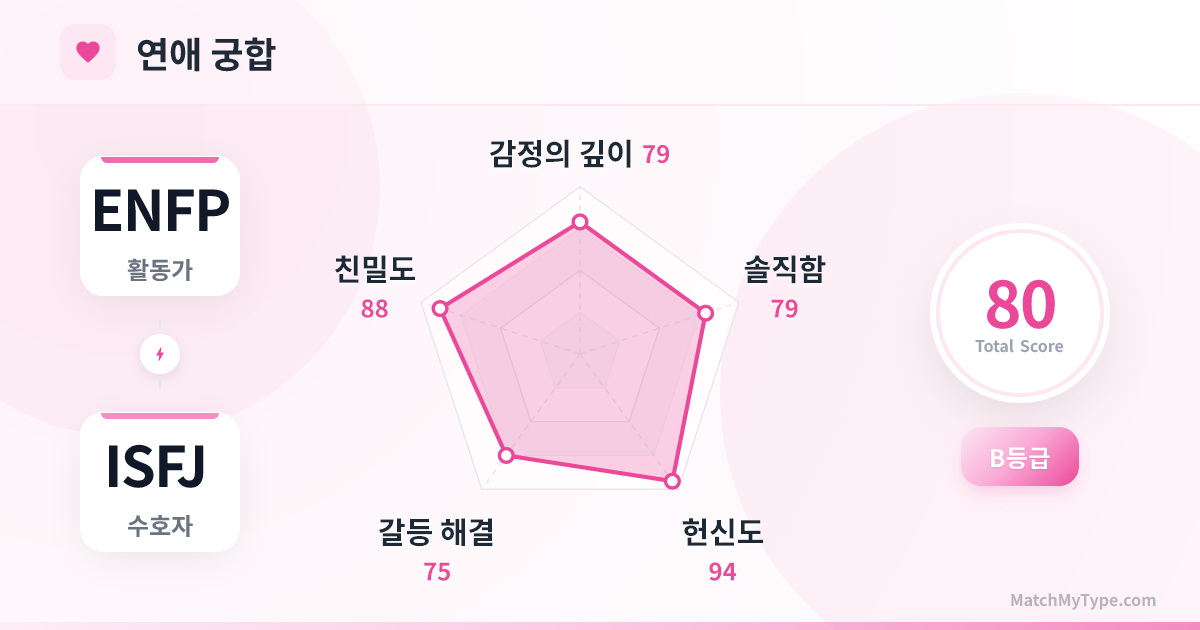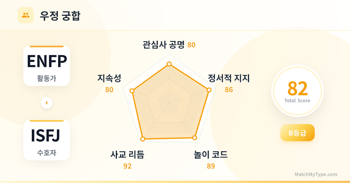 - 3**'변화'에 대한 태도**: ENFP는 변화(이사, 이직)를 즐기지만 ISFJ는 변화를 두려워합니다. ISFJ에게 무리하게 모험을 강요하면 관계가 파탄 날 수 있습니다.