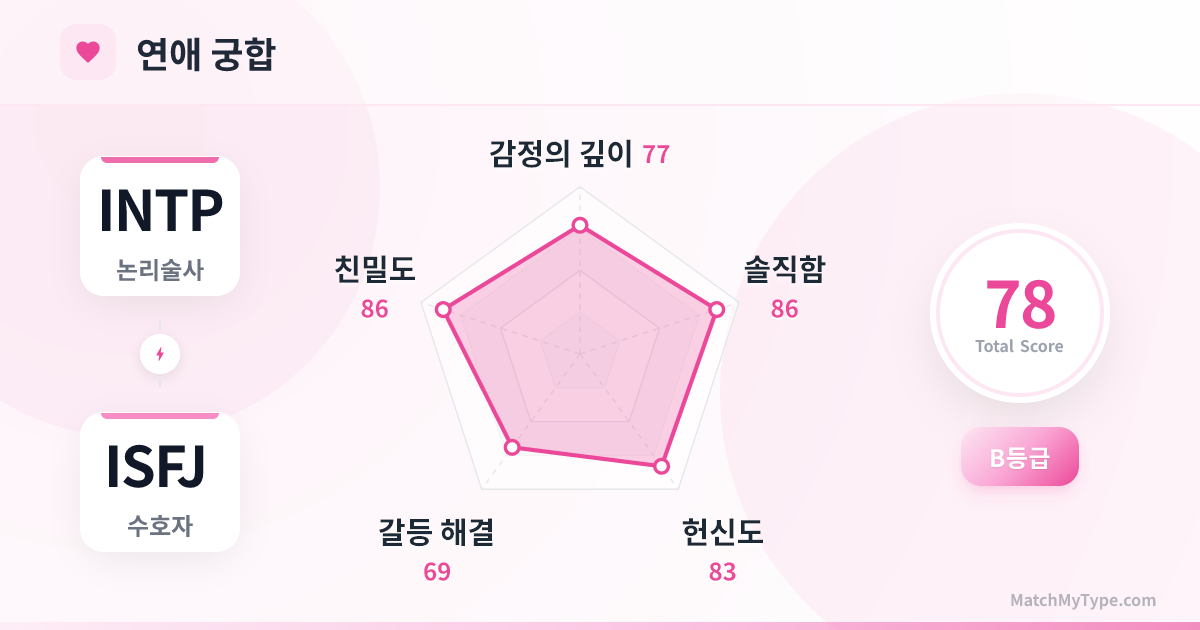 - 3**소통 차원의 어긋남**: INTP는 추상적인 개념(우주, 철학)을 즐기지만, ISFJ는 구체적인 사람과 사건(이웃, 동료)에 대해 이야기하는 것을 좋아합니다. 접점을 찾지 못하면 두 사람은 '할 말이 없는' 어색한 상황에 빠질 수 있습니다.