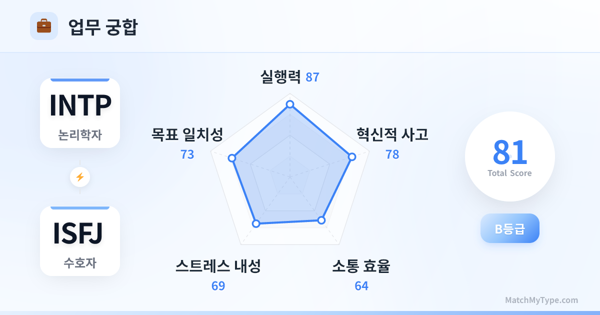 이 조합은 '설계자'와 '실행가'의 만남입니다. INTP는 문제 발견, 시스템 설계, 혁신적 대안 제시에 능하며, ISFJ는 절차 준수, 프로세스 최적화, 완벽한 실행에 능합니다. 서로의 영역을 존중한다면 최고의 효율을 내는 파트너가 될 것입니다.