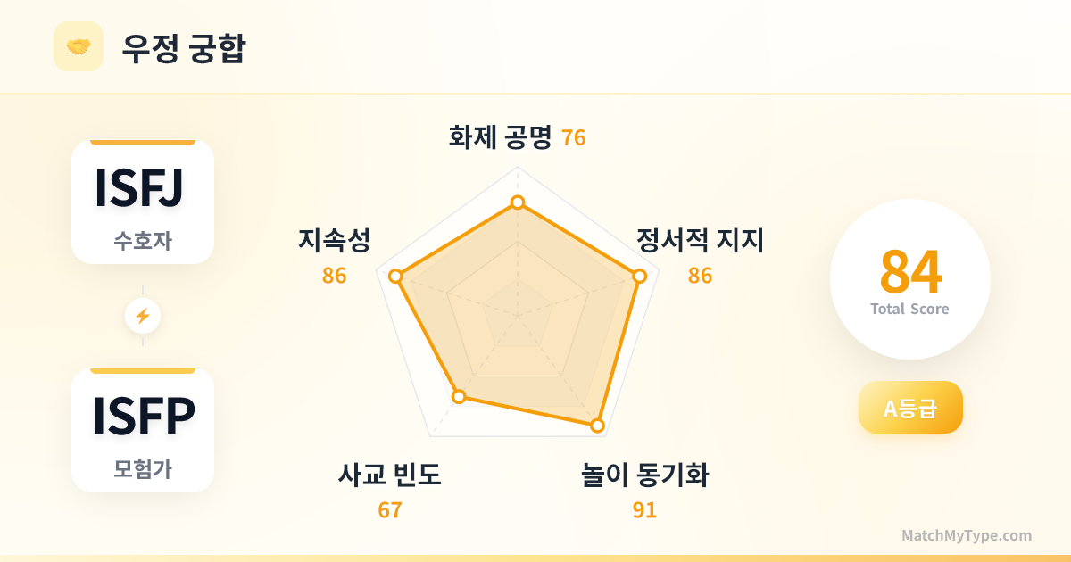 ISFJ와 ISFP의 만남은 온도가 딱 적당한 오후의 홍차 같습니다. 격정적인 파도는 없지만 마음을 적시는 편안함이 가득하죠. 두 사람 모두 내향 감정(I-F) 진영에 속해 있어 평화, 조화, 그리고 사적인 공간을 매우 소중히 여깁니다. ISFJ는 ISFP가 갈망하는 소속감을 제공하고, ISFP는 ISFJ의 단조로운 일상에 색채와 놀라움을 선사합니다.