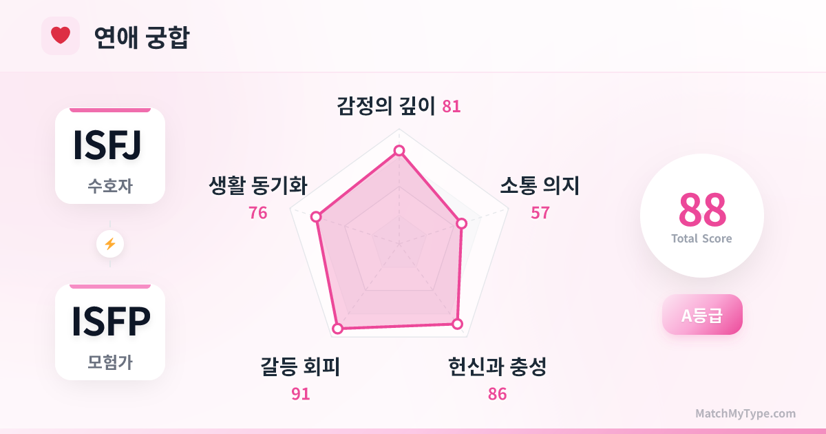이 적응기를 잘 넘기면 훌륭한 균형에 도달합니다. ISFJ는 생활이 잘 굴러가도록 후방을 관리하고, ISFP는 삶의 정취를 책임지며 ISFJ에게 새로운 경험을 선사합니다. 양측 모두 비언어적인 방식으로 서로를 사랑하는 법을 배웁니다.