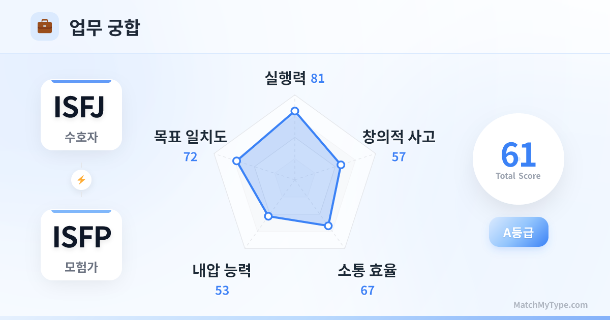 직장에서 이 조합은 '조용한 실무자'들입니다. 회의에서 얼굴을 붉히며 싸우지도 않고, 실현 불가능한 허황된 꿈을 늘어놓지도 않습니다. ISFJ는 프로세스와 질서를, ISFP는 미적 감각과 창의성을 책임집니다. 하지만 두 사람 모두 강한 리더십(Te)이 부족하여 추진력 있는 동료에게 주도권을 뺏기거나, 대대적인 개혁이 필요한 시점에 주저하는 경향이 있습니다.