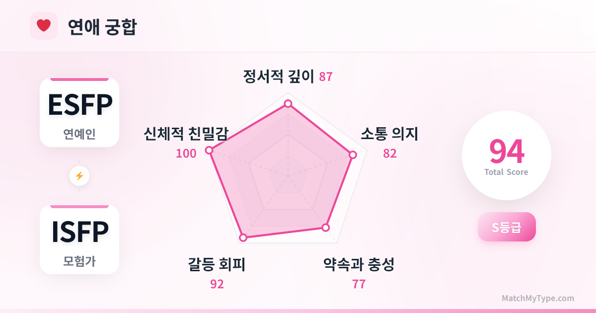 신체적 측면에서 이 조합은 MBTI 내에서도 최상위권입니다. Se 기능으로 인해 두 사람 모두 촉각, 시각, 분위기를 매우 중요하게 생각합니다. 성생활은 단순한 배출이 아니라 서로 교감하는 행위 예술과 같습니다. ESFP는 대개 더 열정적이고 주도적이며 새로운 시도와 뜨거운 분위기를 만드는 것을 좋아합니다. ISFP는 더 섬세하고 감성적이며 감정의 흐름과 순간의 느낌에 집중합니다. 분위기만 잘 조성된다면 두 사람의 합은 매우 높습니다. 유일한 장애물은 낮에 감정적인 충돌(Fi)이 있었을 경우, ISFP는 신체적 접촉을 완전히 거부할 수 있는데 ESFP는 성으로 갈등을 해결하려 할 수 있다는 점입니다. 이는 역효과를 낼 수 있습니다.