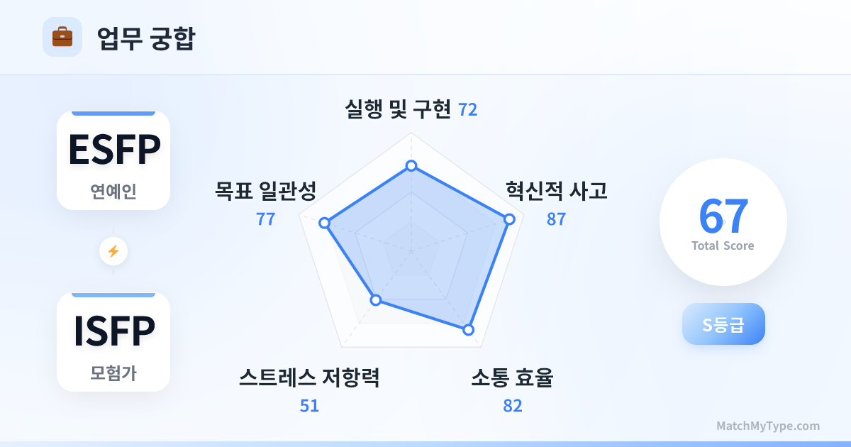 미학과 경험의 극치인 상호 보완. 디자인, 패션, 엔터테인먼트, 이벤트 기획 등의 분야에서 ESFP는 관객의 감정을 움직이는 법을 알고, ISFP는 제품의 질감을 완성하는 법을 압니다. ESFP가 무대 위에서 홍보를 맡고 ISFP가 무대 뒤에서 완성도를 높이는 방식은 히트 상품을 만드는 황금 파트너입니다.