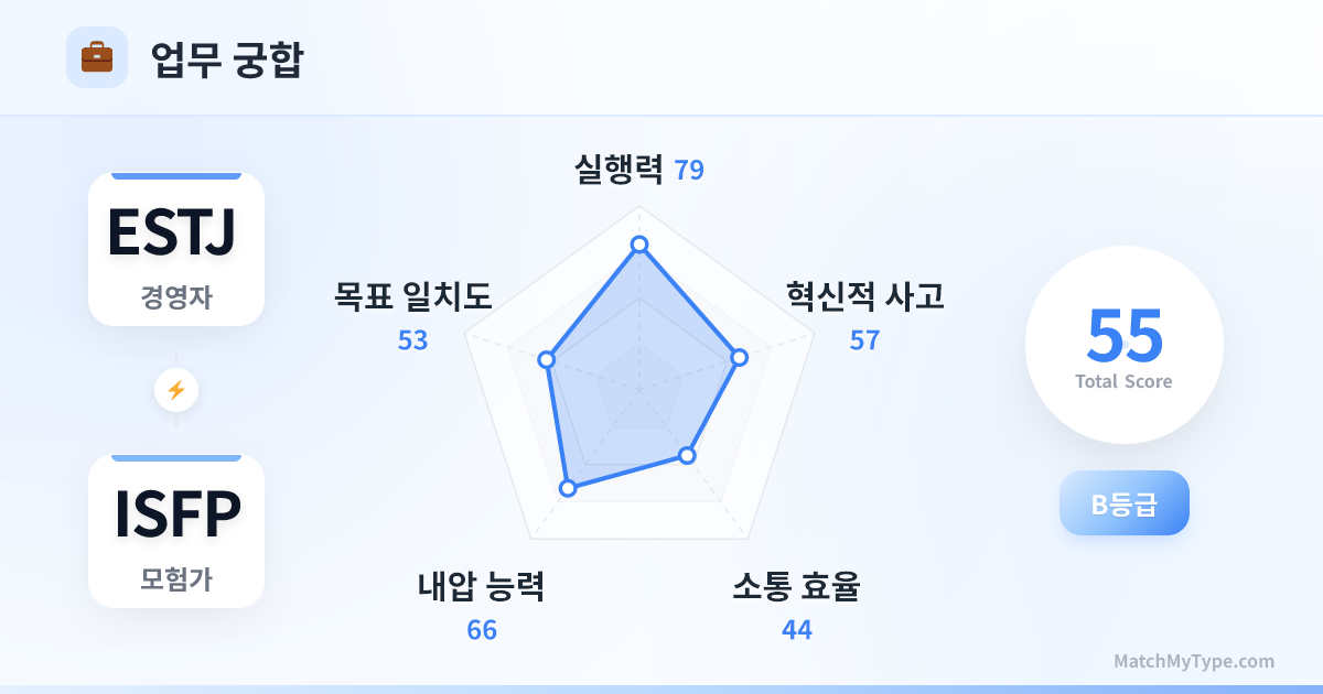 직장에서 이들은 '관리자'와 '장인'의 조합입니다. ESTJ는 판을 짜고, 규칙을 정하고, 영업을 담당하며, ISFP는 제품을 다듬고, 미학적 설계를 하고, 인문학적 배려를 제공합니다. 적소에 배치되면 황금 콤비지만, 잘못 배치되면 서로를 고문하는 관계가 됩니다.