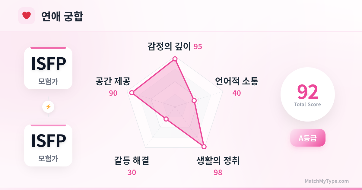 인지 기능 차원에서 이는 동기화된 주파수와 공통된 맹점의 결합입니다. **Fi (내향 감정) x Fi (내향 감정)**: 이것은 양날의 검입니다. 좋을 때는 서로의 가치관과 독립성을 존중하며 무한한 정서적 지지를 보내지만, 나쁠 때는 둘 다 극도로 고집스럽고 예민해집니다. 갈등이 생기면 두 Fi 모두 자신이 피해자라고 느끼며, 감정을 말로 내뱉기보다 가슴속에 묻어두는 경향이 있습니다. **Se (외향 감각) x Se (외향 감각)**: 이것은 즐거움의 원천입니다. 당신들은 현재를 즐기는 향락주의자로, 함께 맛집을 탐방하고 전시회를 보며 자연을 탐험하고 집을 꾸밉니다. 당신들의 연애는 공허한 이론적 토론이 아닌 구체적이고 감각적인 즐거움으로 가득 차 있습니다. **Te (외향 사고) 결핍**: 이것이 가장 큰 위기입니다. 둘 다 '열등 기능'이 Te이므로 계획성, 논리적 실행력, 현실적 문제 해결 의지가 부족합니다. 공과금은 누가 내고, 집안일은 누가 하며, 향후 5년의 계획은 무엇인가요? 이러한 질문들은 생활이 무너질 때까지 무기한 연기될 수 있습니다.