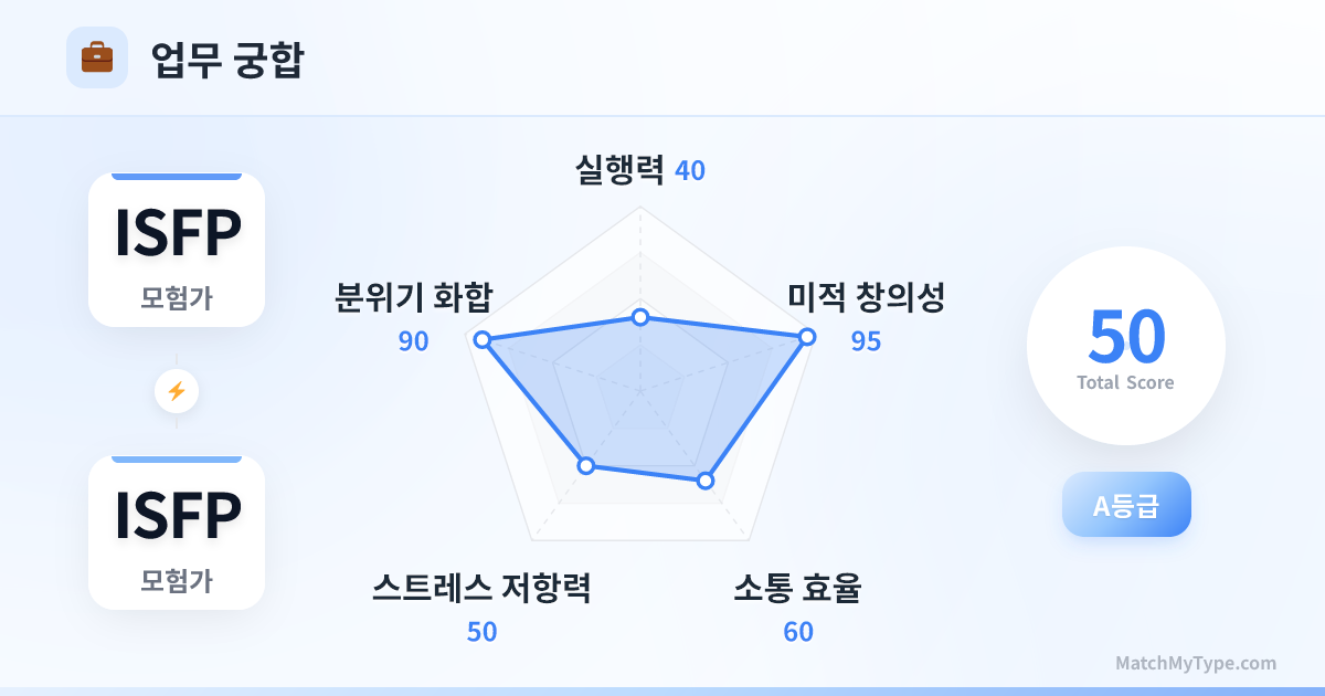 직장에서 두 ISFP의 조합은 '미학의 천장, 효율의 바닥'입니다. 디자인 스튜디오의 파트너라면 세상을 놀라게 할 작품을 만들겠지만, 프로젝트 마감을 지키거나 복잡한 대인 관계 갈등을 해결해야 한다면 재앙이 될 수 있습니다.
