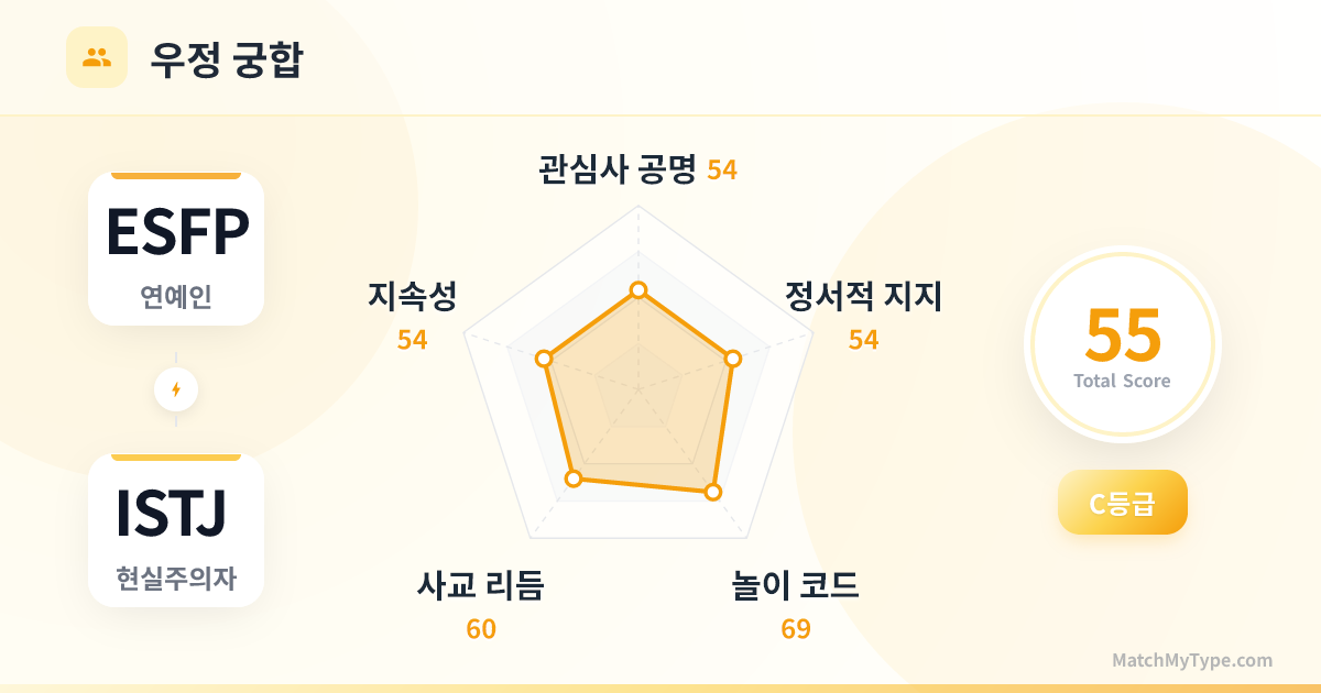 두 사람은 '노는 건 안 맞아도 사는 건 잘 맞는' 친구입니다. ESFP는 ISTJ가 지루하다고 느끼고, ISTJ는 ESFP가 시끄럽다고 느낍니다. 하지만 구체적인 문제(집 인테리어, 여행 계획 등)를 함께 해결할 때 이 우정은 매우 견고해집니다.