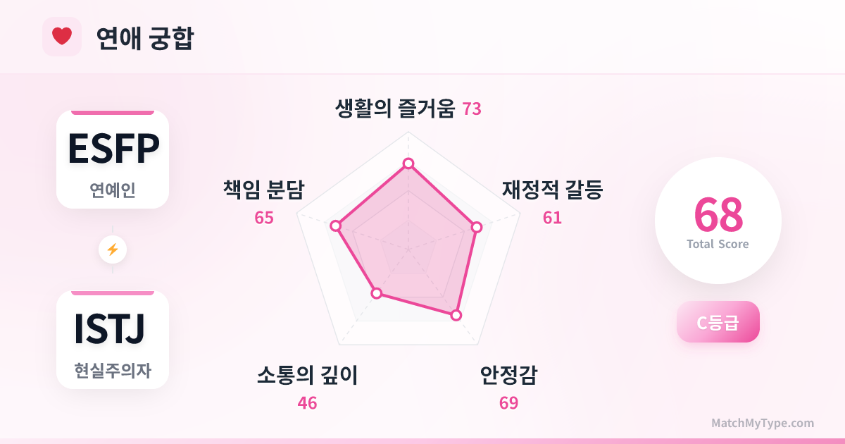 전혀 맞지 않습니다. ESFP는 핵인싸이고 ISTJ는 극도의 자발적 아싸입니다. 모임에서 ESFP가 무대 중앙에 있을 때, ISTJ는 구석에서 휴대폰을 보거나 사람들의 가방을 맡아줍니다. ESFP는 ISTJ를 억지로 자기 서클에 밀어 넣으려 하지 마세요. ISTJ가 옆에 가만히 있어 주는 것만으로도 ESFP는 큰 안심을 얻을 것입니다. ISTJ가 ESFP의 모임에 참석한다는 것 자체가 이미 엄청난 배려이자 희생입니다.