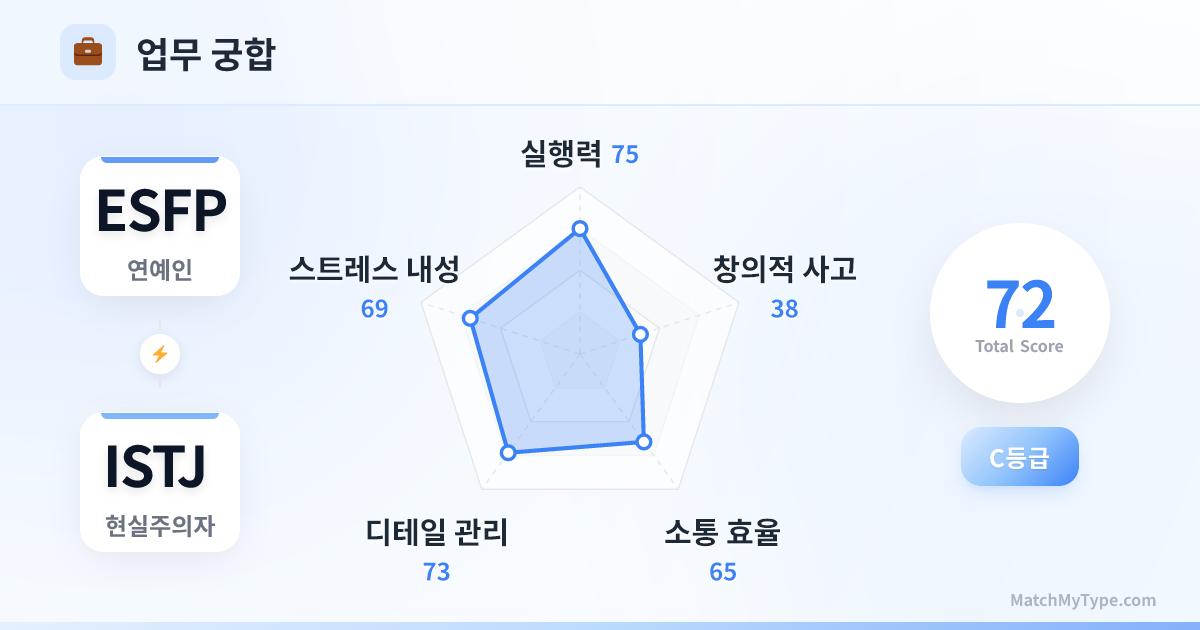 서로 간섭하지 않는 것이 최상의 상태입니다. 물리적으로 분리되는 것이 좋습니다: ESFP는 시끄러운 개방형 공간에서 브레인스토밍을 하고, ISTJ는 조용한 구석에서 데이터를 검토합니다. 회의 시 ESFP는 분위기를 띄우고, ISTJ는 회의록 작성과 실행 항목(To-Do) 추적을 담당하세요.