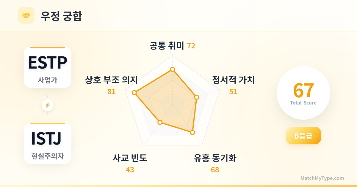 ESTP가 ISTJ를 새로운 맛집이나 활동으로 이끌면, ISTJ는 그 즐거움을 만끽하며 ESTP의 일정을 꼼꼼히 챙겨줍니다. ESTP는 완벽한 내조자/관리자를 얻었다고 느끼고, ISTJ는 삶이 드디어 다채로워졌다고 느낍니다.