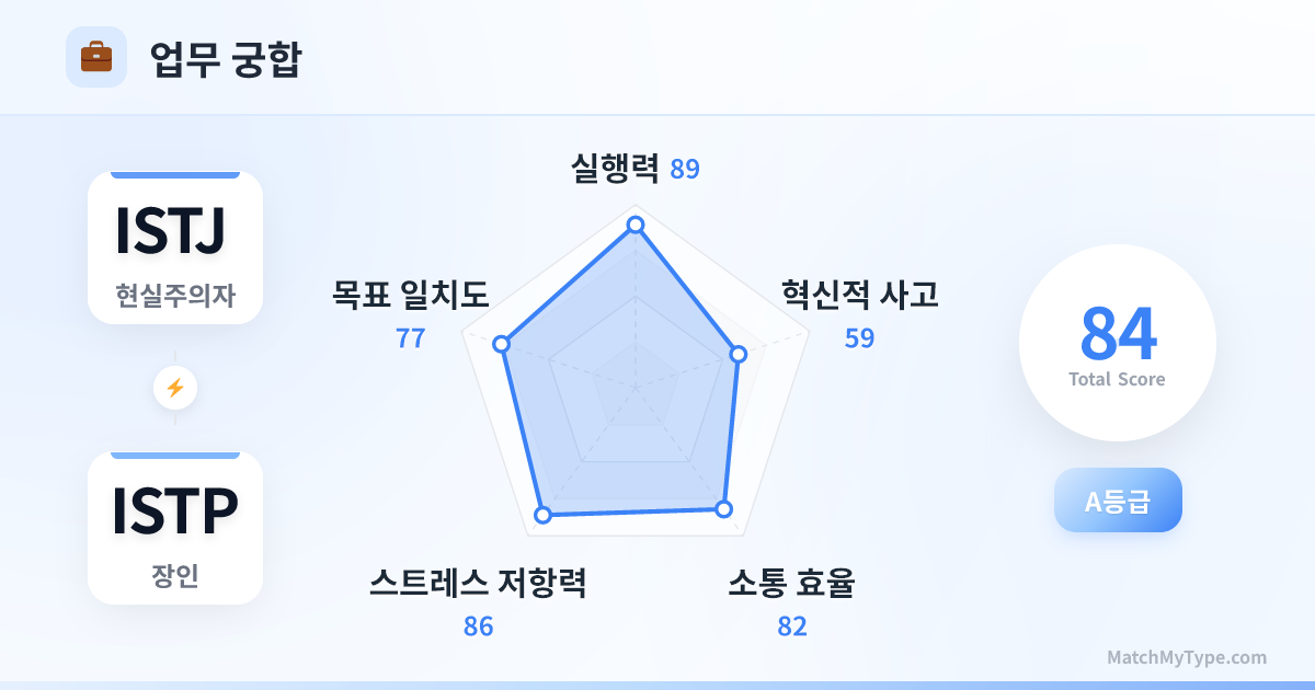프로세스와 기술의 완벽한 결합입니다. ISTJ는 SOP(표준 운영 절차) 수립, 일정 관리, 예산 관리에 능하며, ISTP는 기술적 문제 해결과 구체적인 실행 단계 최적화에 능합니다. 엔지니어링, IT, 외과 수술, 금융 리스크 관리 등 엄격함과 유연함이 동시에 필요한 분야에서 최고의 파트너입니다.