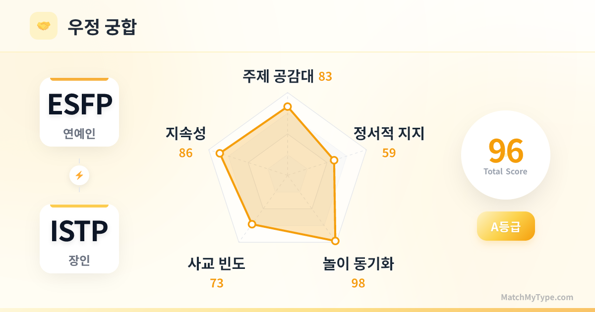 ESFP는 소셜 나비이고, ISTP는 소셜 관찰자입니다. 파티에서 ESFP가 분위기를 띄우면, ISTP는 구석에서 쿨하게 술을 마시며 가끔 날카로운 한마디로 모두를 폭소케 합니다. ESFP는 지루한 사람으로부터 ISTP를 보호해주고, ISTP는 ESFP가 취했을 때 집까지 안전하게 업어다 줍니다. 이는 매우 훌륭한 '정중동'의 결합입니다.