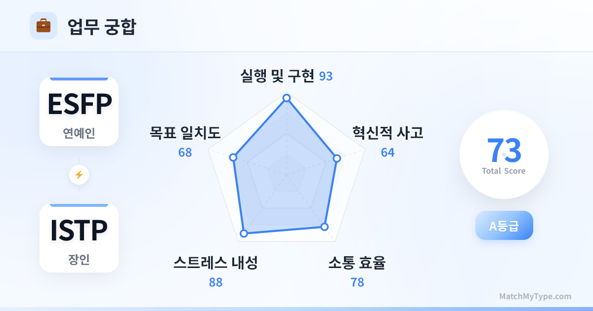 실행력이 폭발적입니다. ESFP는 '사람'을 다루는 데 능하고, ISTP는 '일'을 해결하는 데 능합니다. 영업, 홍보, 응급 구조, 현장 실행, 연예 오락 등의 분야에서 ESFP는 전면에서 활약하며 시선을 끌고, ISTP는 후방에서 기술적 문제를 해결하며 프로세스를 원활하게 유지합니다. 호흡이 환상적입니다.