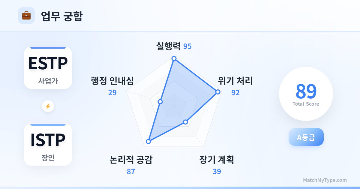 결과 중심적입니다. ESTP 상사는 ISTP 부하의 독립성과 능숙함을 좋아하며, 문제만 해결한다면 출퇴근 시간 같은 것에 개의치 않습니다. 다만 ESTP의 즉흥적인 업무 변경은 집중을 선호하는 ISTP를 지치게 할 수 있습니다.