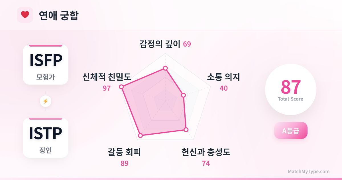 서로의 '마이웨이' 기질에 매력을 느낍니다. ISTP는 ISFP를 수수께끼처럼 느끼고, ISFP는 ISTP를 쿨가이라고 생각합니다. 데이트는 대개 야외 활동 위주의 재미있고 감각적인 자극이 가득한 시간이 됩니다.