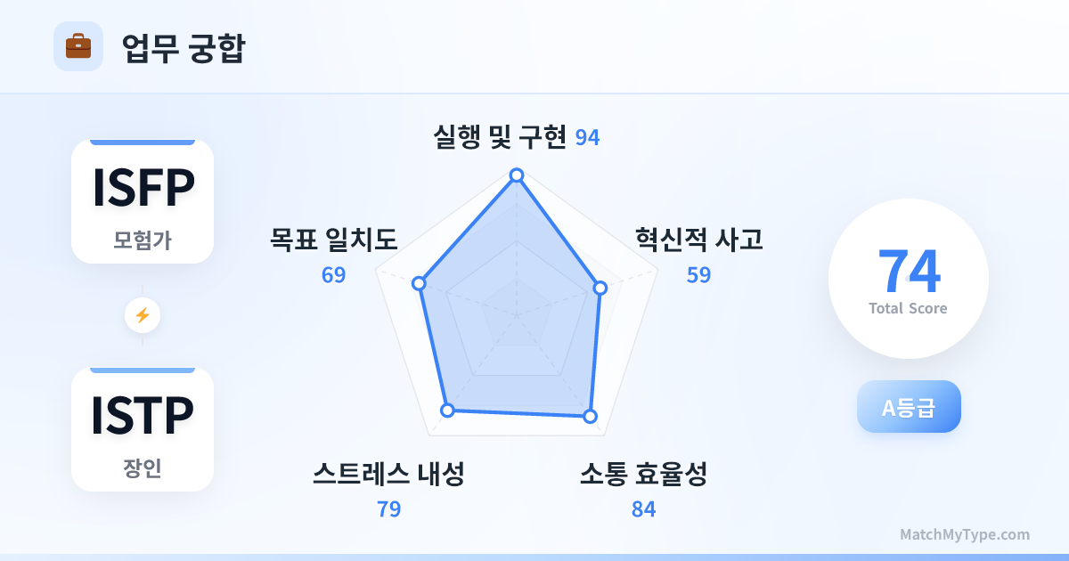 환상의 특수부대 파트너입니다. 분업이 확실한 작업에 적합합니다. ISFP가 프런트엔드 UI, 사용자 경험, 인테리어를 맡고 ISTP가 백엔드 코드, 구조 설계, 하드웨어 유지보수를 맡는 식입니다. 서로의 전문 영역을 침범하지 않는 한, 최고의 효율을 자랑하는 조합입니다.