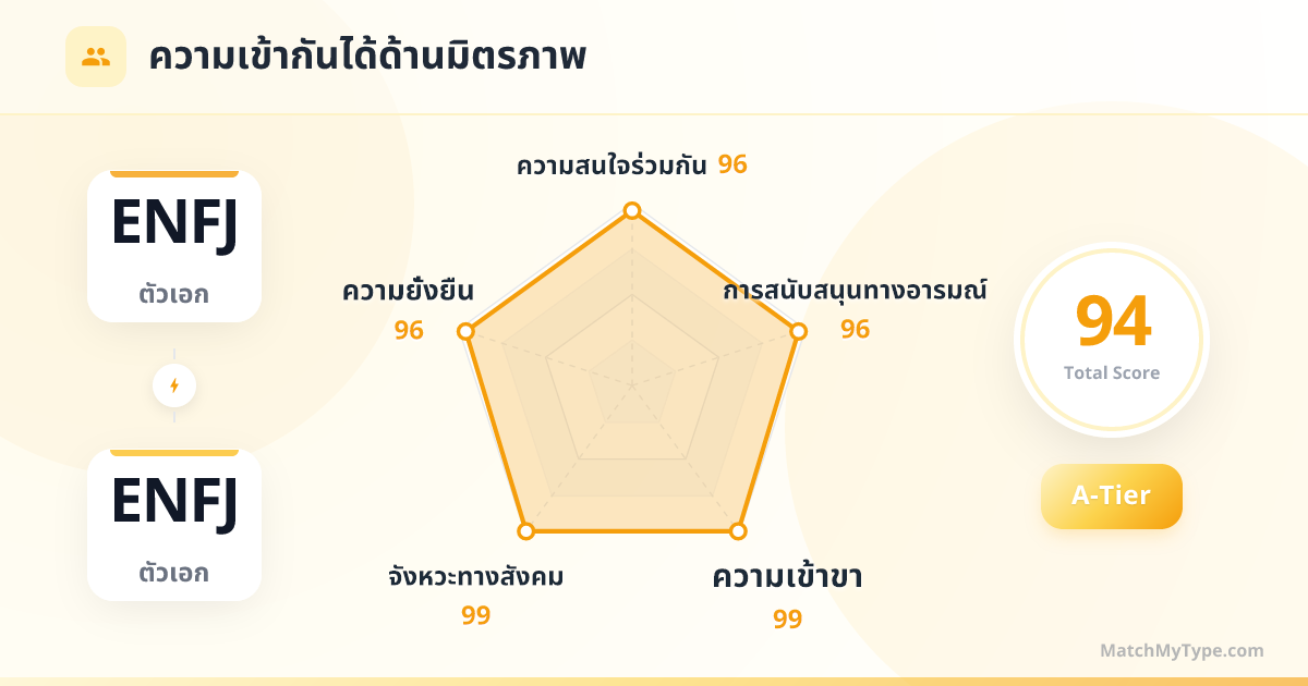 การรวมตัวของ ENFJ x ENFJ เปรียบเสมือนการส่องกระจก ในที่สุดคุณก็ได้พบกับคนที่ปรารถนาจะทุ่มเทเหมือนคุณ ให้ความสำคัญกับรายละเอียดเหมือนคุณ และเป็นคนที่พร้อมจะเอ่ยคำว่า 'รัก' ได้บ่อยเท่าคุณ ความสัมพันธ์นี้มักเริ่มต้นอย่างเร่าร้อน เพราะทั้งคู่เชี่ยวชาญในการสร้างบรรยากาศโรแมนติกและให้คุณค่าทางอารมณ์ แต่ต้องระวังว่าเมื่อ 'ผู้ให้' สองคนมาอยู่ด้วยกัน บางครั้งอาจจะรู้สึกเหนื่อยจากการแย่งกันปรนนิบัติ หรือปกปิดปัญหาที่แท้จริงเพียงเพราะไม่อยากทำลายความสงบสุข