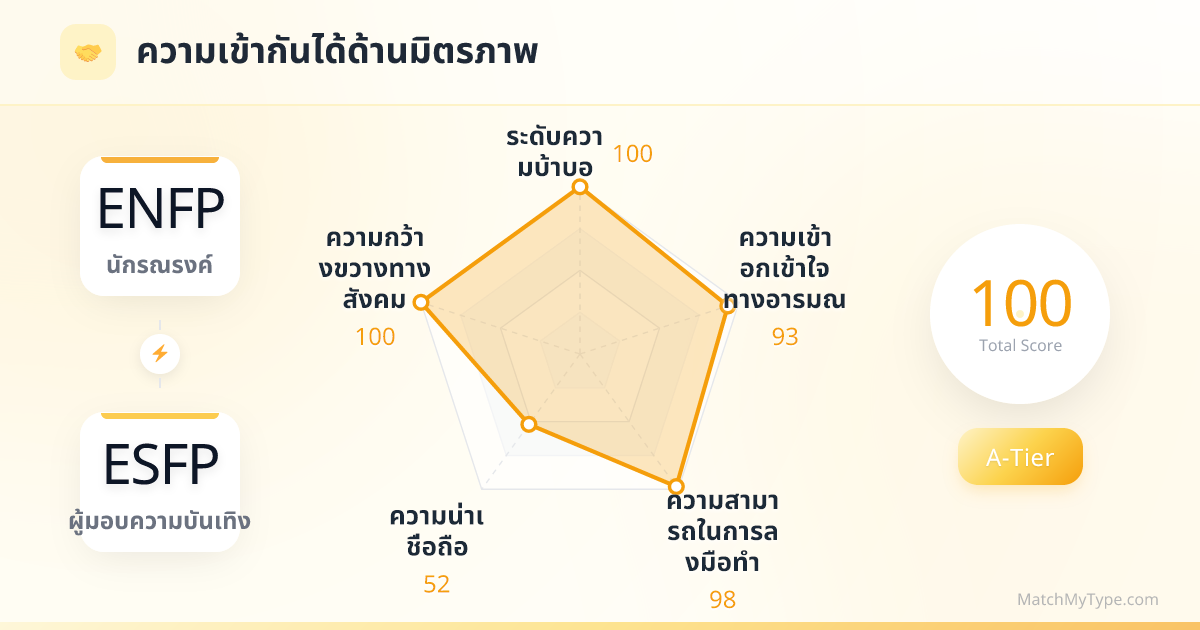 นี่คือการเฉลิมฉลองของ 'คลื่นความถี่ที่ตรงกัน' ENFP มักรู้สึกว่าตัวเองเป็นคนแปลกแยก แต่บุคลิกที่อบอุ่นและไม่เคยตัดสินคนอื่นของ ESFP ทำให้ ENFP รู้สึกผ่อนคลายอย่างยิ่ง ในทางกลับกัน ESFP จะหลงใหลในความคิดแปลกๆ และนิมิตอันโรแมนติกในหัวของ ENFP โดยรู้สึกว่า ENFP เหมือนนักมายากลที่คอยสร้างเซอร์ไพรส์ได้เสมอ ทั้งคู่เกลียดการผูกมัด กฎเกณฑ์ และความน่าเบื่อ เมื่ออยู่ด้วยกันจึงเหมือนมีพันธมิตรในการต่อต้านโลกที่แสนจำเจ