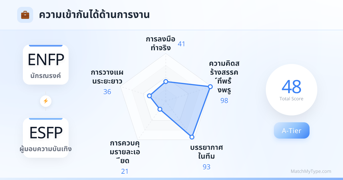 ENFP อย่าใช้คำอุปมาที่นามธรรมเกินไป ให้บอก ESFP ตรงๆ ว่า 'ต้องทำอะไร' ส่วน ESFP อย่าขัดจังหวะตอน ENFP กำลังร่างไอเดีย ให้ถามเพิ่มอีกนิดว่า 'ความหมายเบื้องหลังไอเดียนี้คืออะไร'