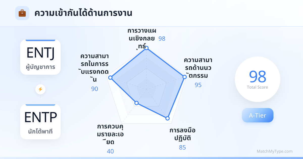 ครอบคลุมห่วงโซ่ตั้งแต่ 0 ถึง 1 ไปจนถึง 100 ENTP เก่งในการสร้างจากความว่างเปล่า นำเสนอแนวคิดที่พลิกโลก (0 ถึง 1) ENTJ เก่งในการจัดทัพ เปลี่ยนแนวคิดให้กลายเป็นอาณาจักรธุรกิจที่เลียนแบบได้ (1 ถึง 100) ENTP คือกุนซือ ENTJ คือแม่ทัพ