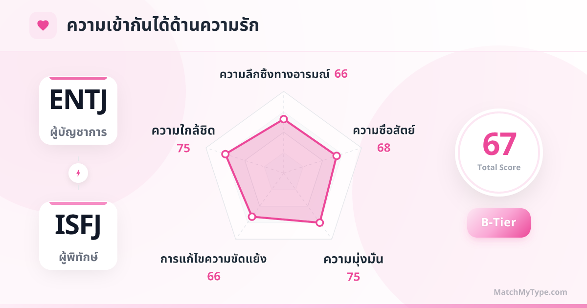 นี่ไม่ใช่การพบกันที่เต็มไปด้วยบทกวีหรือความโรแมนติกเหนือธรรมชาติ แต่เป็นพันธมิตรที่มั่นคงบนพื้นฐานของ 'ความสัมพันธ์เชิงอุปสงค์และอุปทาน' ENTJ ต้องการฐานที่มั่นคงเพื่อวางแผนความทะเยอทะยาน ส่วน ISFJ ต้องการผู้นำที่แข็งแกร่งเพื่อมอบความรู้สึกปลอดภัย หากทั้งสองฝ่ายสามารถก้าวข้ามช่องว่างขนาดใหญ่ในวิธีการสื่อสารได้ นี่จะเป็นคู่ครองทางโลกที่แข็งแกร่งที่สุด