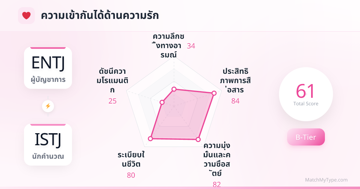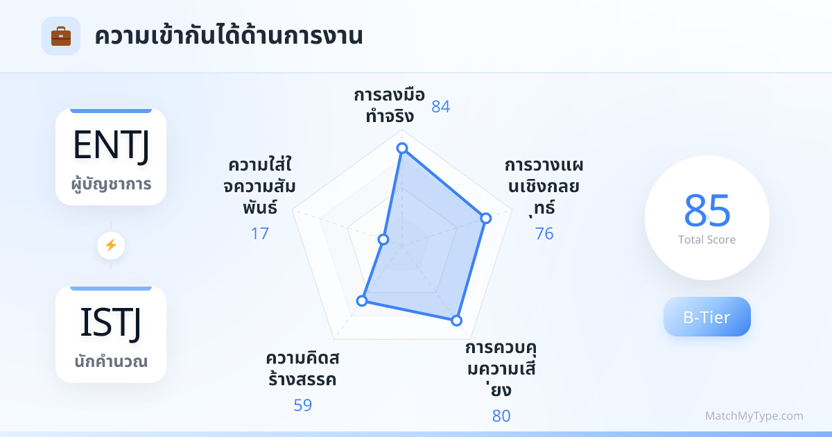 นี่คือ 'ดรีมทีม' ในที่ทำงาน ENTJ คือ CEO ที่กุมบังเหียน และ ISTJ คือ COO ที่มั่นคง หากจัดการความขัดแย้งระหว่าง 'นวัตกรรม' และ 'การรักษามาตรฐานเดิม' ได้ คุณแทบจะทำลายคู่แข่งได้ทุกคนและบรรลุ KPI ที่ยากที่สุดได้