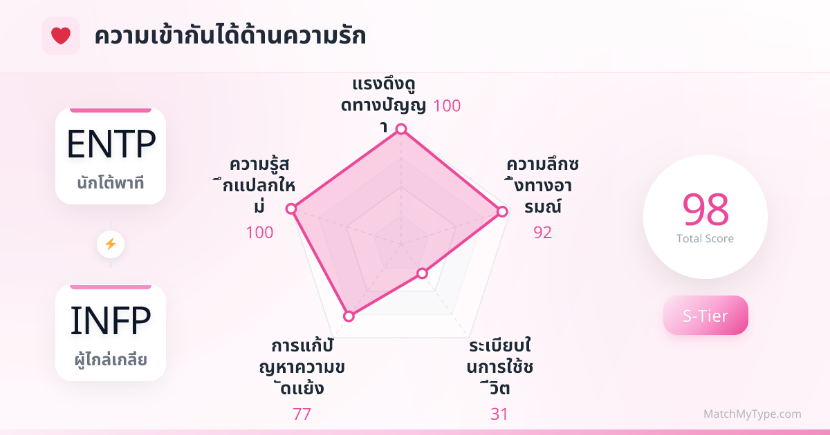 เมื่อประกายไฟแห่งตรรกะของ ENTP จุดไฟเผาป่าแห่งอารมณ์ของ INFP นี่คือการผจญภัยที่เริ่มต้นจากการประลองปัญญาและจบลงที่การสั่นสะเทือนของจิตวิญญาณ ทั้งวุ่นวายและมีเสน่ห์