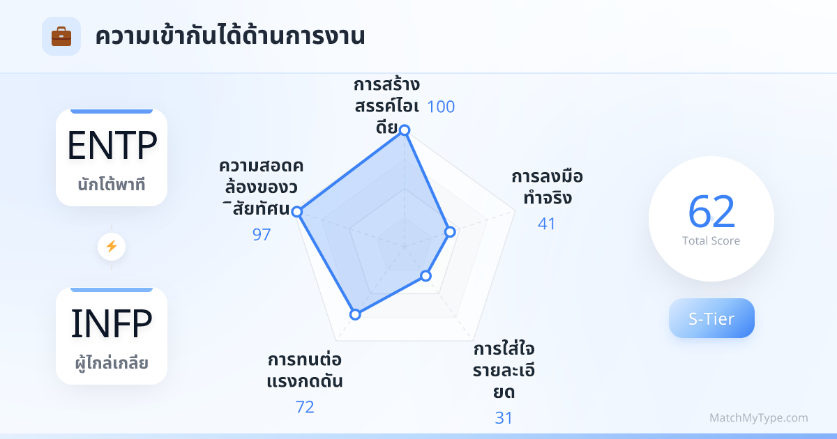 คู่หูชวนอู้งาน หากนั่งโต๊ะติดกัน คุณอาจจะถูกหัวหน้าตำหนิเพราะคุยกันสนุกเกินไป ในโปรเจกต์ร่วมกัน แนะนำให้ ENTP รับผิดชอบการนำเสนองานภายนอก การเจรจาต่อรอง และการหาทรัพยากร ส่วน INFP รับผิดชอบการสร้างสรรค์เนื้อหา ความสวยงาม และการประสานงานภายใน แต่อย่าให้ทั้งคู่ดูแลเรื่องการจัดการตารางเวลาพร้อมกันเด็ดขาด