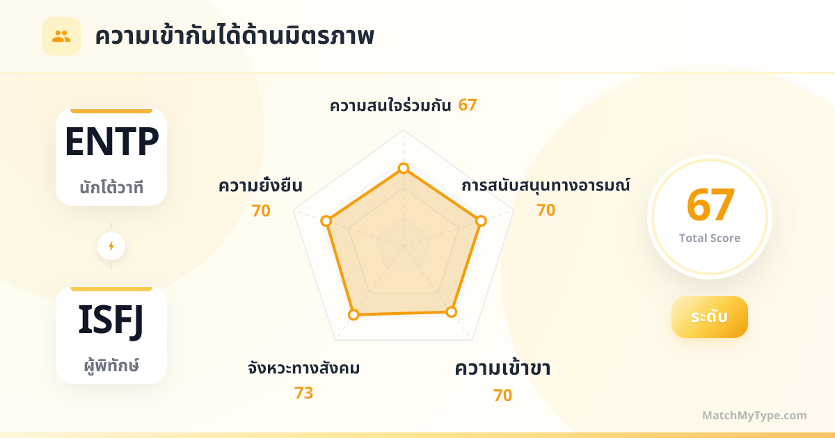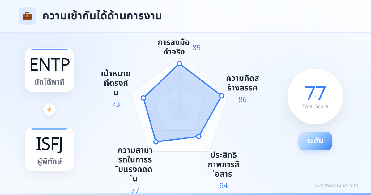 นี่คือคู่หูทองคำระหว่าง 'นักฝัน' และ 'นักปฏิบัติ' ENTP รับผิดชอบนวัตกรรมจาก 0 ถึง 1 ส่วน ISFJ รับผิดชอบการดูแลและดำเนินการจาก 1 ถึง 100 ตราบใดที่คุณเคารพวิธีทำงานของกันและกัน คุณจะเป็นทีมที่ไร้เทียมทาน