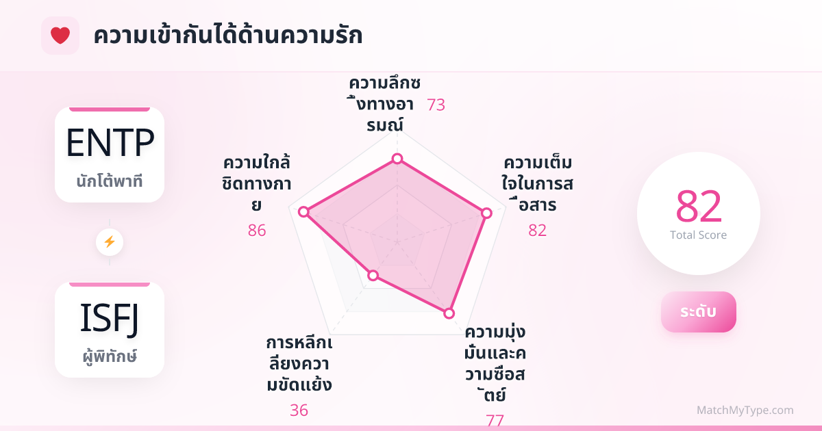 **อนาคตที่ไม่ตรงกัน**: ENTP อยู่กับอนาคต ISFJ อยู่กับอดีตและปัจจุบัน หาก ENTP เอาแต่ 'ขายฝัน' แต่ไม่ทำจริง ความรู้สึกมั่นคงของ ISFJ จะพังทลายลง