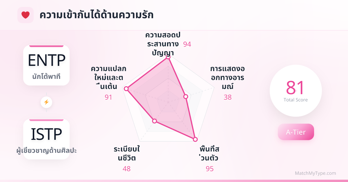 นี่ไม่ใช่ละครรักหวานเลี่ยนแบบที่คุณคุ้นเคย แต่เป็นหนังแอคชั่นที่เต็มไปด้วยตลกร้าย การรวมตัวของ ENTP และ ISTP มักเริ่มต้นจาก 'ความรู้สึกว่าอีกฝ่ายคูลหรือน่าสนใจ' ทั้งคู่เกลียดการบีบบังคับทางอารมณ์และพันธนาการแบบเดิมๆ ความสัมพันธ์แบบ 'ไอคิวสูง ดูแลอารมณ์ต่ำ' นี้จึงเป็นการปลดปล่อยสำหรับทั้งคู่